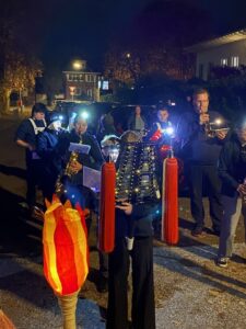 Der Musikzug der Freiwilligen Feuerwehr Braak spielte schöne Laterne Lieder und gemeinsam mit unseren Eltern, Lehrerinnen und Lehrern liefen wir auf der abgesperrten Straße los. Es war richtig spannend, dort zu gehen, wo sonst Autos fahren! Zum Glück war auch unser Schulpolizist dabei – so fühlten wir uns ganz sicher.