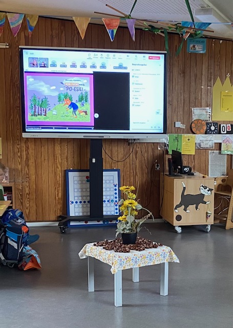 Für uns war das die bisher schönste Lesung, weil wir bei dem Regenwetter ganz gemütlich in unserem Klassenraum saßen und am Smartboard live mitmachen konnten.