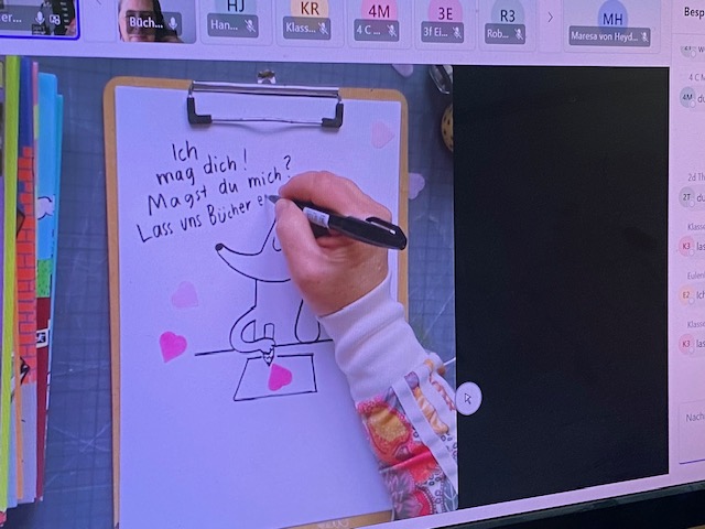 Die Autorin Franziska Biermann hat ihr lustiges Kinderbuch „Herr Fuchs mag Poesie“ vorgelesen. Bevor es losging, wurde uns erklärt, was ein Autor ist und was Poesie bedeutet. Danach startete die digitale Lesung – und wir hatten richtig viel Spaß! Unsere Klassenlehrerin schrieb fleißig unsere Antworten in den Chat, sodass alle Kinder unsere Ideen sehen konnten.